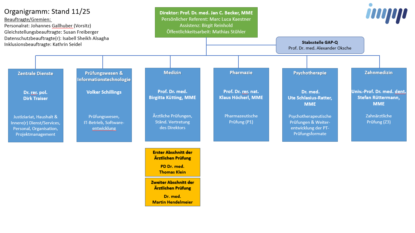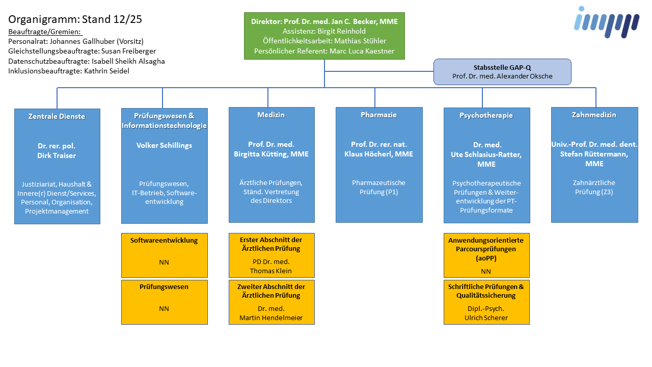 Das Institut für medizinische und pharmazeutische Prüfungsfragen (IMPP) ist eine rechtsfähige Anstalt des öffentlichen Rechts. Als zentrale Einrichtung der Länder unterstützen sechs Fachbereiche mit mehr als 100 MitarbeiterInnen die Landesprüfungsämter bei der Durchführung der bundeseinheitlichen schriftlichen Prüfungen nach den Approbationsordnungen für Ärzte und Apotheker sowie nach dem Psychotherapeutengesetz sowie den zugehörigen Ausbildungs- und Prüfungsverordnungen für Psychologische Psychotherapeuten und Kinder- und Jugendlichenpsychotherapeuten und nach der Approbationsordnung für Zahnärzte und Zahnärztinnen. Bei den jeweils zuständigen Landesprüfungsämtern melden sich Studierende zur Prüfung an, von dort erhalten sie die Ladung zur Prüfung und nach der Prüfung den Prüfungsbescheid. Zur einheitlichen und damit die Chancengleichheit wahrenden Durchführung der bundeseinheitlichen Examina arbeiten Landesprüfungsämter und IMPP eng zusammen.
